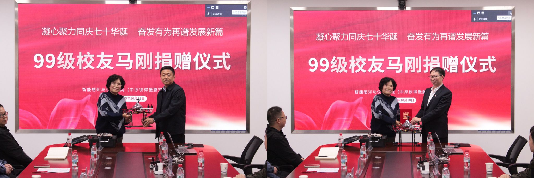 在温馨的座谈中,99级校友马刚通过视频连线发起了一场特别的捐赠。他深情回忆起在校求学的点点滴滴,感恩母校的培养与关怀,并向学院捐赠无人机飞控教学套件10套及现金12000元。原电子信息学院教师王岚作为他的班主任也分享了他在校期间勤奋好学、积极进取的成长故事,言语间充满欣慰与自豪。随后,王岚老师代为将捐赠物资正式移交学院,并代表马刚校友接受了学院颁发的捐赠证书。