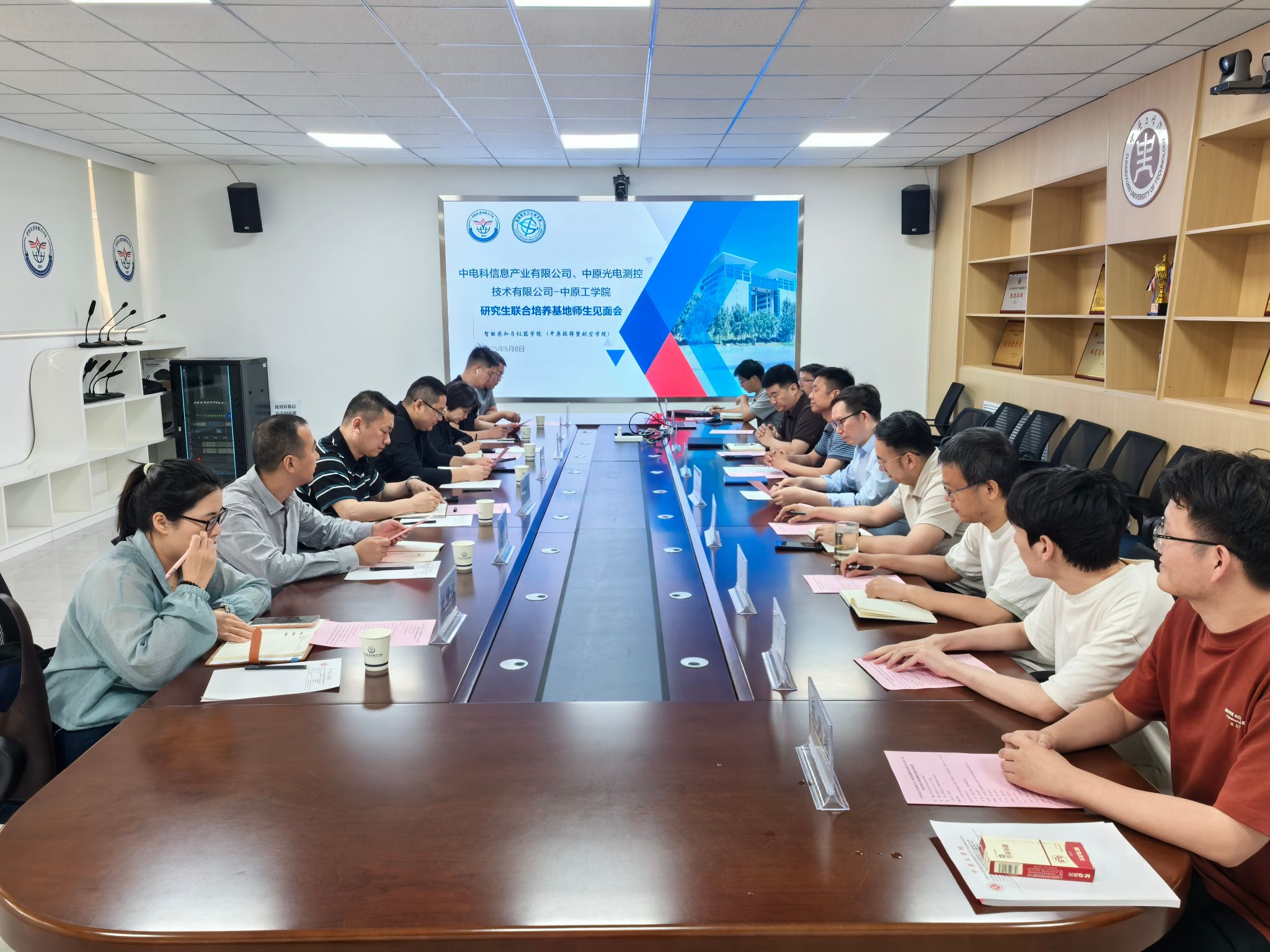 研究生联合培养基地师生见面会在龙湖校区举行。中电科信息产业有限公司党总支书记、常务副经理李明、中原光电测控技术有限公司党总支书记、副总经理韩靓、中国电子科技集团第27研究所重点实验室党总支书记田晓军、中原彼得堡航空学院党总支书记轩信飞、Feet9